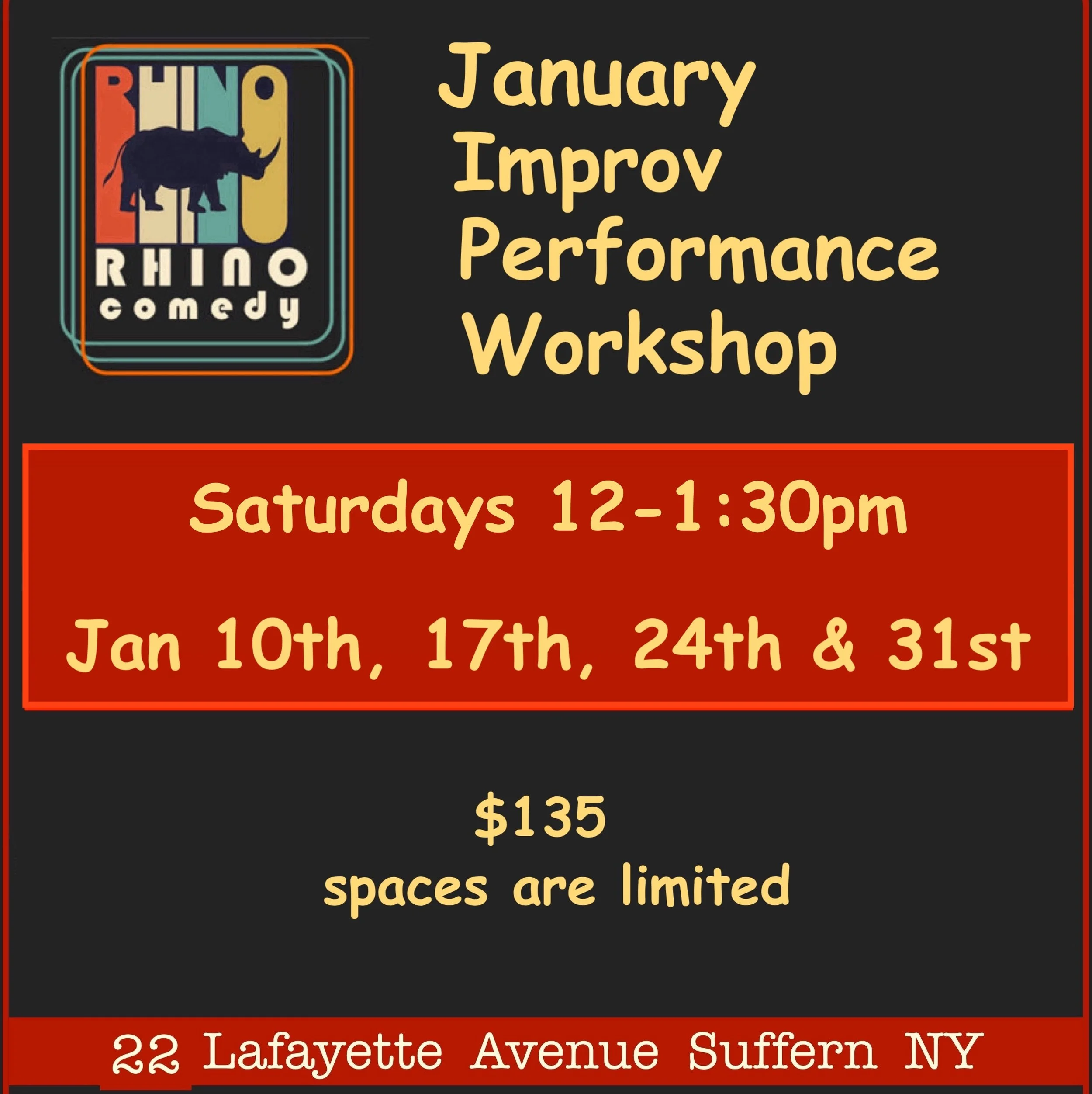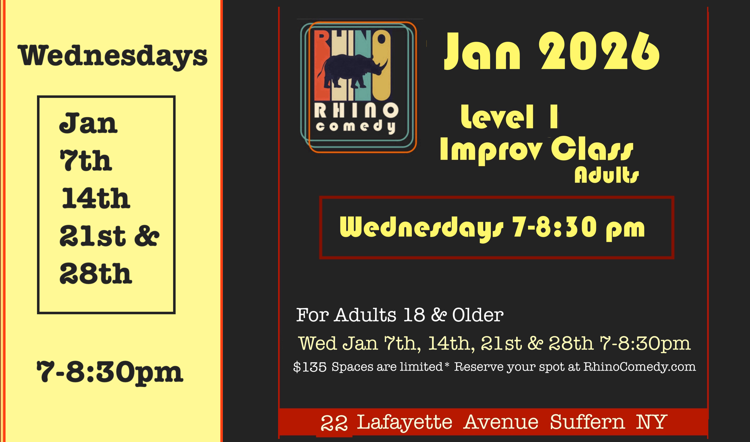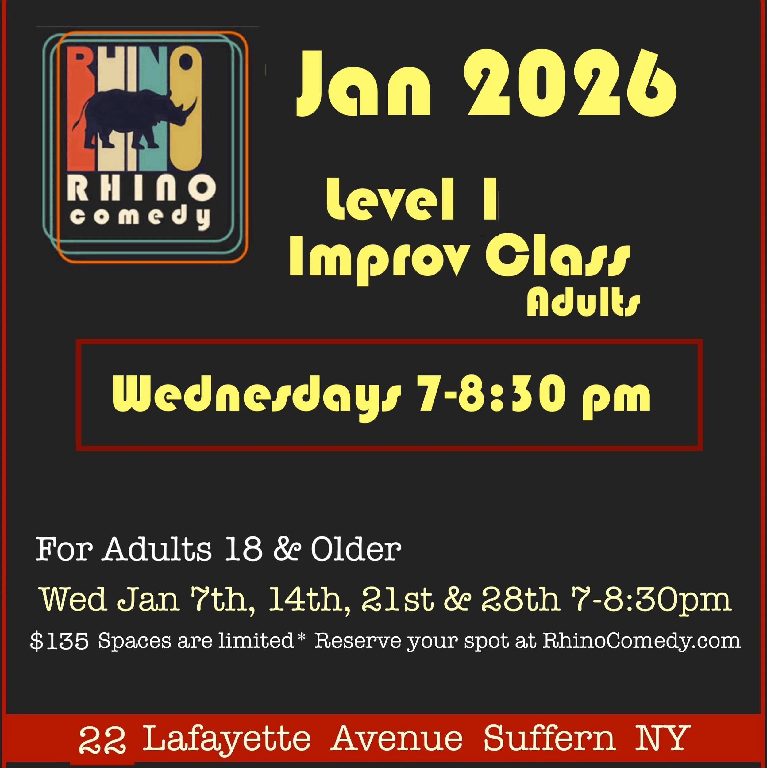 COMING UP: January Classes & Workshops now open for sign-ups Become a Patreon Supporter! 〰️ Become a Patreon Supporter! 〰️ Become a Patreon Supporter! 〰️ Jan 2026 Level One Improv Class - Wednesday Eve 7-8:30 $135.00 January Improv Performance Workshop Saturdays 12-1:30pm $135.00 Thurs Dec 4th Open Mic 8pm $5.00 Fri Dec 5th Happy Hour Trivia 7pm $0.00 Sat Dec 6th Rhino Room Stand Up 8pm $20.00 Sat Dec 6th After-Show Mic 10pm $5.00 Thurs Dec 11th Open Mic 8pm $5.00 Fri Dec 12th Retro Game Show Night Minute to Win It 8pm $12.00 Sat Dec 13th Rhino Room Stand Up 8pm $20.00 Sat Dec 13th After-Show Mic 10pm $5.00 Thurs Dec 18th Open Mic 8pm $5.00 Fri Dec 19th Another Fruitcake Improv Comedy 8pm $15.00 Fri Dec 19th Post-Show Improv Jam 10pm $5.00 Sat Dec 20th Rhino Room Stand Up 8pm $20.00 Sat Dec 20th -- NO LATE MIC -- $0.00 Sold out Thurs Dec 25 Closed for Holiday $0.00 Sold out Fri Dec 26th Rhino Comedy Contest 8pm $12.00 Sat Dec 27th Rhino Room Stand Up 8pm $20.00 Sat Dec 27th After-Show Mic 10pm $5.00 Jan 2026 Level One Improv Class - Wednesday Eve 7-8:30 (Copy) $135.00 Hardware bar Billy Tarantino PIzza Scan the QR Code Above for Our Seasonal Menu Full Menu Wine and Craft Beer Judy Gold Loves Rhino Comedy Follow us on Instagram! View fullsize View fullsize View fullsize View fullsize View fullsize View fullsize View fullsize View fullsize