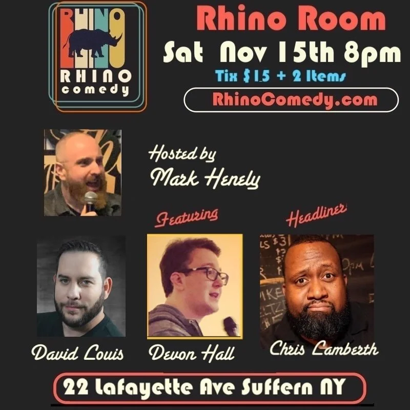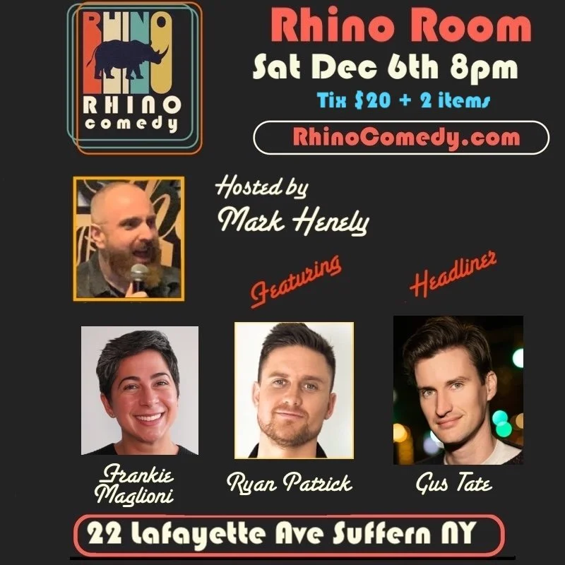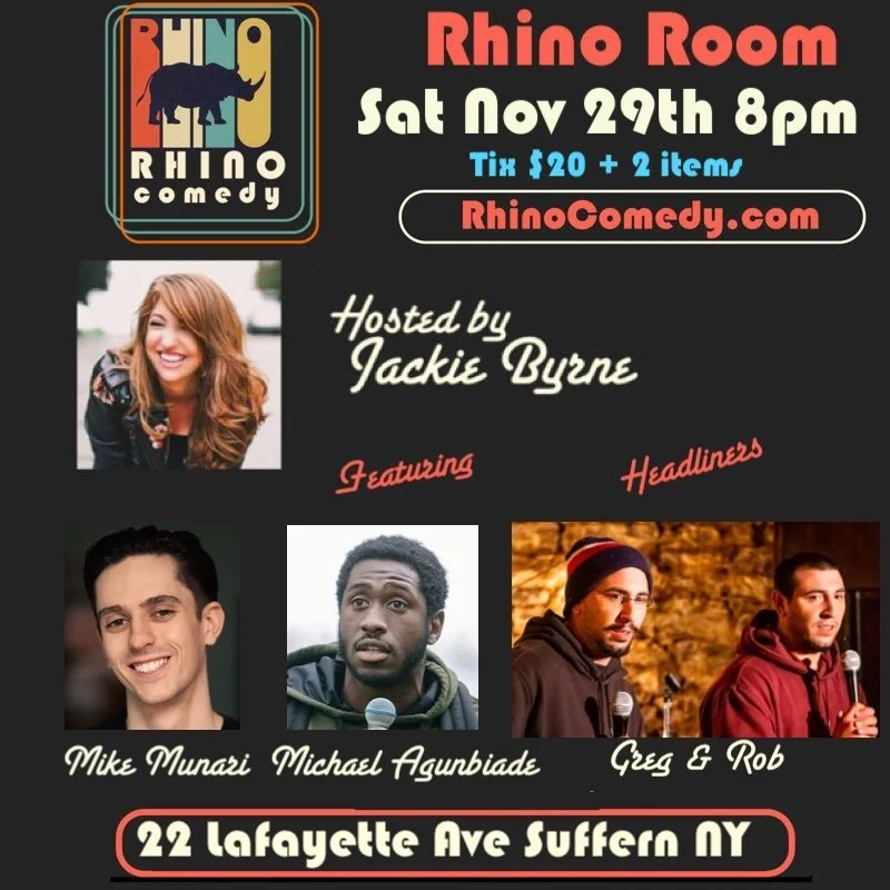 COMING UP: Fri Nov 28th *Special* Thanksgiving Family Improv Jam 7pm Become a Patreon Supporter! 〰️ Become a Patreon Supporter! 〰️ Become a Patreon Supporter! 〰️ Thurs Nov 13th Open Mic 8pm $5.00 Fri Nov 14th A Moveable Feast Improv Comedy 8pm $15.00 Fri Nov 14th Post-Show Improv Jam 10pm $5.00 Sat Nov 15th Rhino Room Stand Up 8pm $15.00 Sat Nov 15th After-Show Mic 10pm $5.00 Thurs Nov 20th Open Mic 8pm $5.00 Fri Nov 21st Comedy Contest 8pm $12.00 Sat Nov 22nd Rhino Room Stand Up 8pm $15.00 Sat Nov 22nd After-Show Mic 10pm $5.00 Thurs Nov 27th CLOSED FOR THANKSGIVING $0.00 Sold out Fri Nov 28th Special Thanksgiving Family Improv Jam 7pm $12.00 Sat Nov 29th Rhino Room Stand Up 8pm $20.00 Sat Nov 29th After-Show Mic 10pm $5.00 Thurs Dec 4th Open Mic 8pm $5.00 Fri Dec 5th Happy Hour Trivia 7pm $0.00 Sat Dec 6th Rhino Room Stand Up 8pm $20.00 Sat Dec 6th After-Show Mic 10pm $5.00 Thurs Dec 11th Open Mic 8pm $5.00 Sat Dec 13th Rhino Room Stand Up 8pm $20.00 Sat Dec 13th After-Show Mic 10pm $5.00 Thurs Dec 18th Open Mic 8pm $5.00 Sat Dec 20th Rhino Room Stand Up 8pm $20.00 Sat Dec 20th -- NO LATE MIC -- $0.00 Sold out Thurs Dec 25 Closed for Holiday $0.00 Sold out Fri Dec 26th Rhino Comedy Contest 8pm $12.00 Sat Dec 27th Rhino Room Stand Up 8pm $20.00 Sat Dec 27th After-Show Mic 10pm $5.00 Hardware bar Billy Tarantino PIzza Scan the QR Code Above for Our Seasonal Menu Full Menu Wine and Craft Beer Judy Gold Loves Rhino Comedy Follow us on Instagram! View fullsize View fullsize View fullsize View fullsize View fullsize View fullsize View fullsize View fullsize